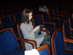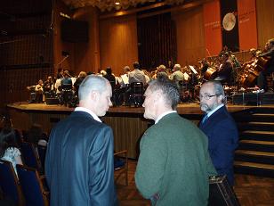 som följer med på turnén, bra sätt att veta vad farsan egentligen sysslar med! Samtidigt skapas en tröja kanske? Med ryggarna mot kameran står från vänster till höger: Tryggve Palmqvist, assisterande orkesterchef, han ska hålla reda på alla musiker och informera om allt som tänkas kan. Ytterst är han ansvarig för att en fulltalig orkester alltid finns på plats, inga problem än så länge, alla är friska och på plats. Bredvid Tryggve står vår solooboist, Mårten Larsson och till höger om honom Martin Söderlund, orkesterassistent. Martin och Tryggve är musikernas trygghet ute i världen och föralldel hemma i Konserthuset också! Nu är det dags att springa iväg till Beethoven-halle (allt heter något med Beethoven i Bonn, t.o.m. en parkeringsplats!) Urban Ward