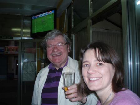 svanor än vi. Vidare är det söndag = helig fotbollsdag, det står en TV på hög volym vart man än går. Hursomhelst släckte vi törsten på en lokal bar, fullt med gubbar som bara rökte och kollade fotboll, inte en turist i sikte. Och det blir intrycket av första kvällen i denna stad, medan andra delar av ön är turistgetton skulle Santa Cruz kunna vara vilken spansk stad som helst. Få öppna restauranger, ingen kunde engelska där vi hamnade, men maten var god! Christer Thorvaldsson som slutade som förste konsertmästare i våras spelar ännu med orkestern tog kommandot så vi fick litet tapas, gazpacho, kanariepotatis (underbart goda) och calamares. Slutet gott allting gott! Från värmen i syd, Urban Ward.