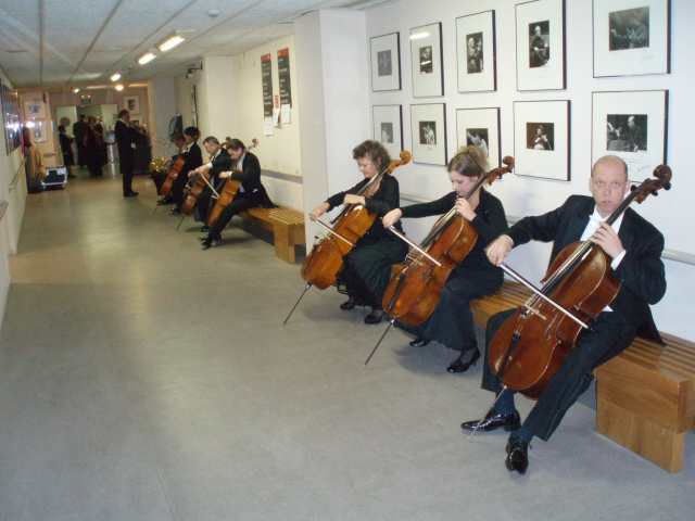 Strax innan konserten började värmde ett gäng cellister upp i en korridor, en skön syn och ett härligt humleliknande surr från instrumenten. Många andra instrumentalister hittar ett eget hörn att spela i, men cellister måste ju sitta ner och här fanns tydligen en passande bänk.
