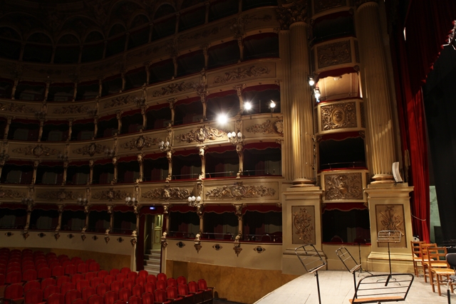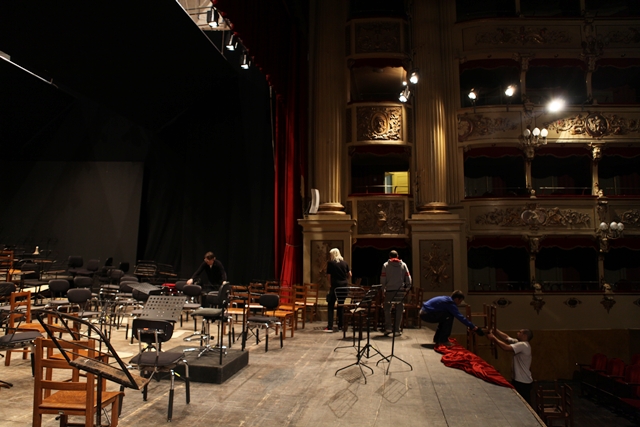 Medan många checkade in på hotellen och vilade eller gick ut på jakt efter mat begav jag mig ut i Perugias små svindlande gränder med målet Teatro Morlacchi. Dit hade trailern med instrument och podieteknikerna redan anlänt och skulle påbörja sitt jobb. På grund utav Perugias små gator fick trailern poliseskort in i staden. Vilken grej! Proffsigt körde de in med den välpolerade lastbilen. Det är inte bara staden Perugia som är liten till storlek, så är även podiet i Teatro Morlacchi byggd år 1780. Snacket gick att på grund av podiets komprimerade yta skulle kanske några ur stråkstämman få hoppa över kvällens konsert. Alltså, podieteknikernas ”dukande” av podiet idag fick ju inte bara missas.