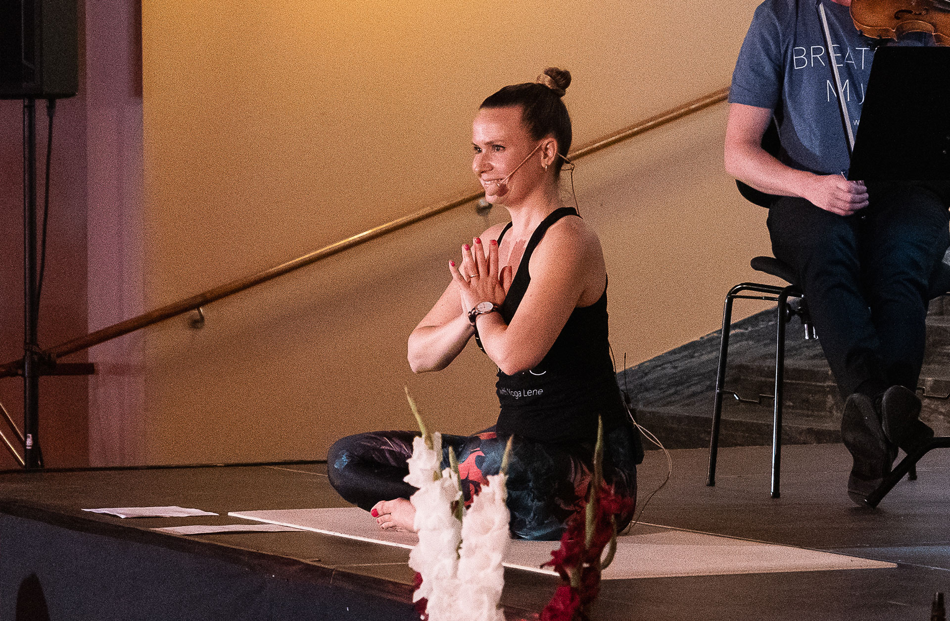 Duktiga tekniker hade byggt upp scenen, till och med lite bättre än vad vi hade önskat. Producenten hade hittat en underbar blomma från kungabesöket veckan innan som vi fick låna, det var städat och fixat med mysig höstbelysning. Vi testade ljudbalans och ljus, och musikerna fick utrymme att öva ännu lite till. Sen var det insläpp och in kom en massa underbara yogisar med färgglada yogamattor och härlig energi och vi kunde sätta igång.