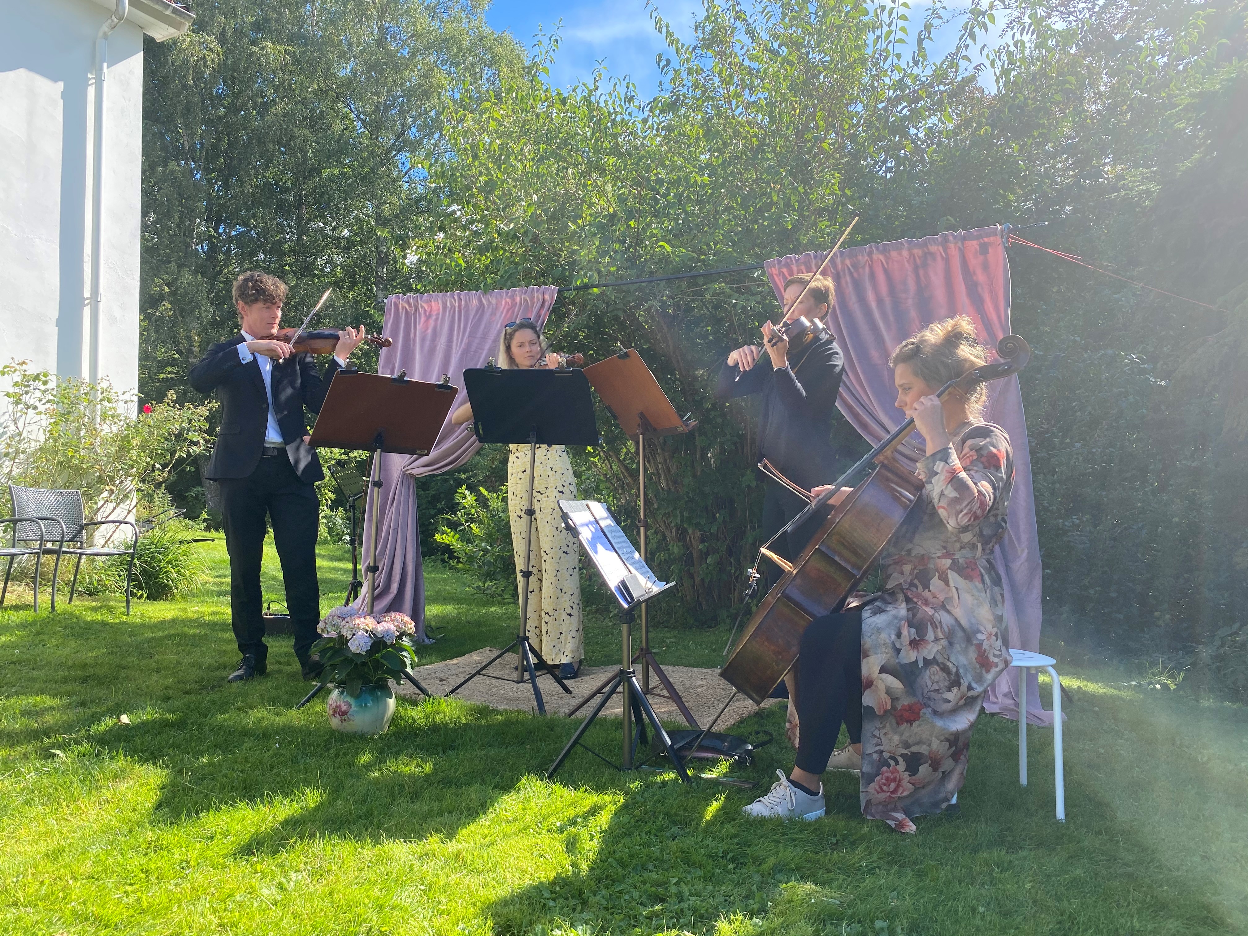 Stråkkvartetten med tre violiner och en cello intog scenen och när taglet började stryka strängarna tystnade fåglarna i ljudet av Brahms, Sibelius och Mozart. Vår trädgård fylldes med innerlighet, lekfullhet och dramatik.
