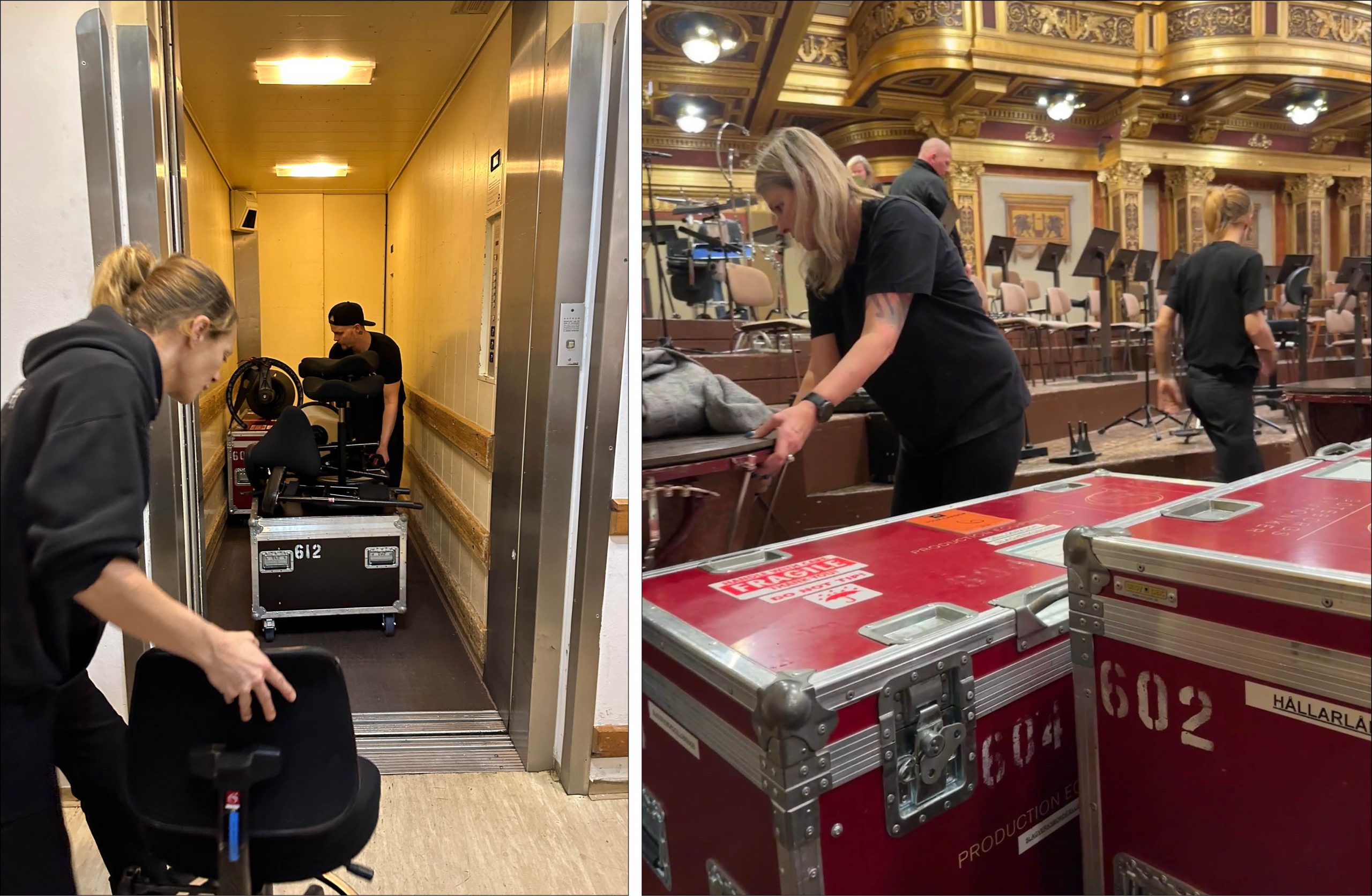 Det är trekvart kvar till konsert. 98 musiker ur Göteborgs Symfoniker, en tysk violinsolist och en finsk chefdirigent i obskyr t-shirt har tagit plats på podiet i Wien för soundcheck. Hälften är ombytta till frack, någon äter äpple, stråkar och armbågar petas åt olika håll och stämljuden från alla instrument tävlar med varandra, samtidigt som fler stolar, notställ, stativ lyfts fram och transportlådor bärs ut. Symfonikernas fyra scentekniker är som tagna ur en Marvelfilm: endast superkrafter och trofasthet kan montera en full symfoniorkester på en kvart. Fyra trappor upp.