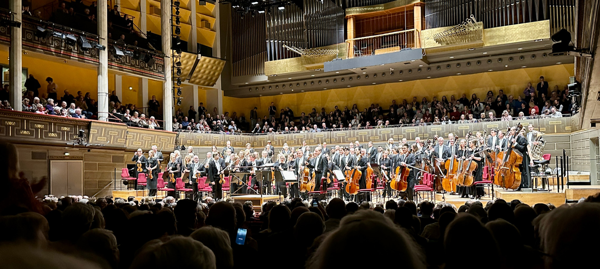 Det är en ivrig parad av 106 musiker, några med instrumenten på ryggen, som marscherar den korta vägen till Hötorget och Ivar Tengboms vackra, blå konserthus. “Ett riktigt favoritställe”, avslöjar violasten Lars Mårtensson. Tidschemat är pressat och efter ett kort akustikprov tillsammans med chefdirigent Santtu-Matias Rouvali är det dags för konsert. Stockholmarna har fyllt varenda sittplats och konserthuschef Stefan Forsberg ser till att publiken välkomnar Sveriges Nationalorkester med ett jubel.