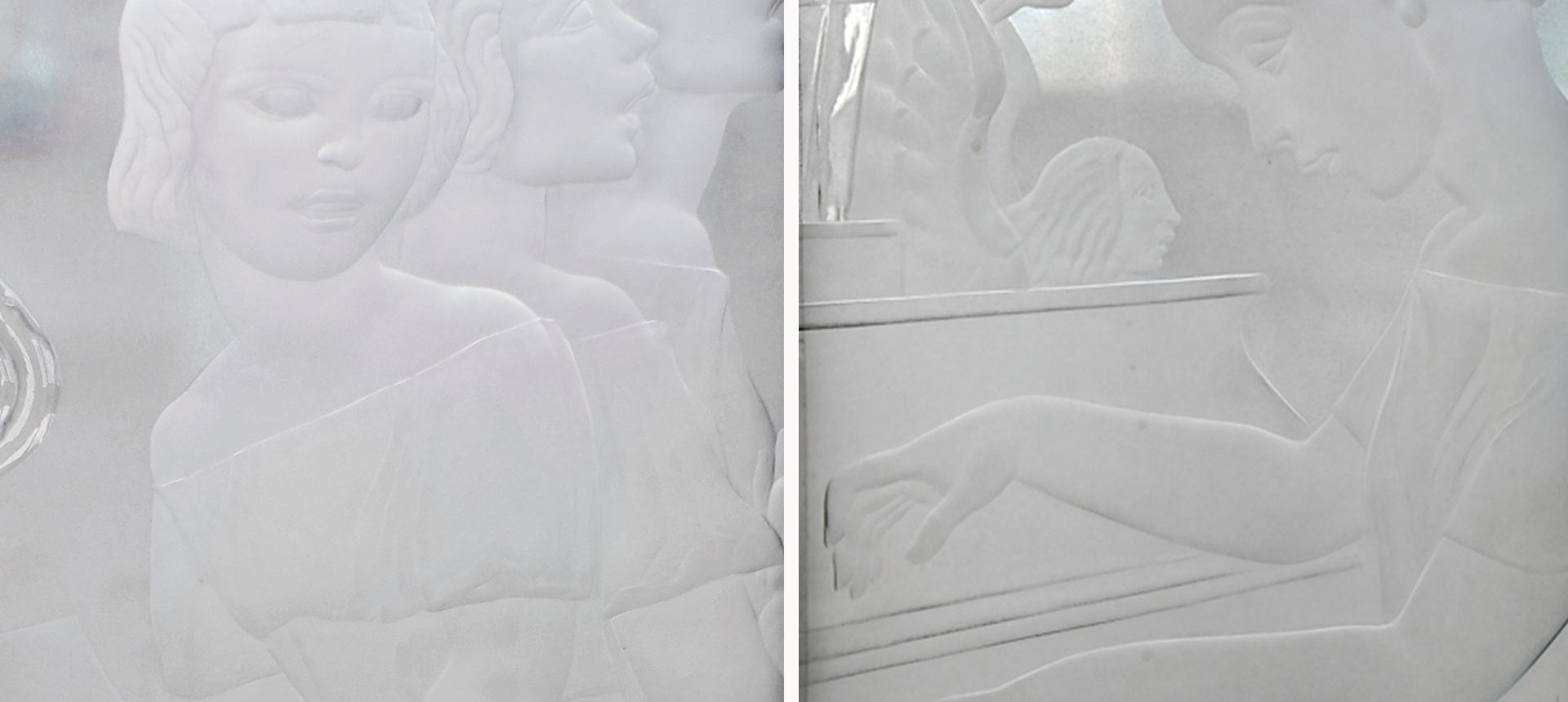Singing, playing people create such beautiful tones from their throats and with their instruments that the angels listen in their heaven. The five glass reliefs (engravings) from 1935 were created at Orrefors glassworks by Simon Gate (1883-1945) and the engraver Bertil Gustafsson.
