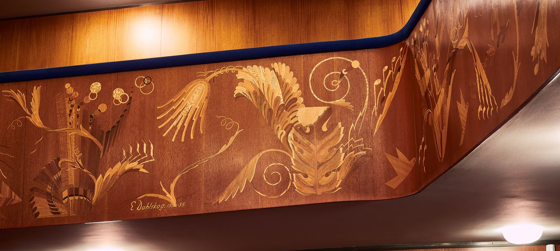 Intarsian i Stenhammarsalen med titeln Den tonande naturen sträcker sig som en arabesk runt läktarens barriär. Den börjar med en havsgud som trumpetar i en snäcka och slingrar sig sedan vidare i figurationer gränsande mellan abstrakta mönster, lövrankor och blomklockor. Mitt i arabesken flammar en gyllene lyra upp. Fåglar i sträck, susande snäckor och sjöhästar för arabesken till sitt slutmål – ännu en havsgud, denna gång med en lyra i sina armar.