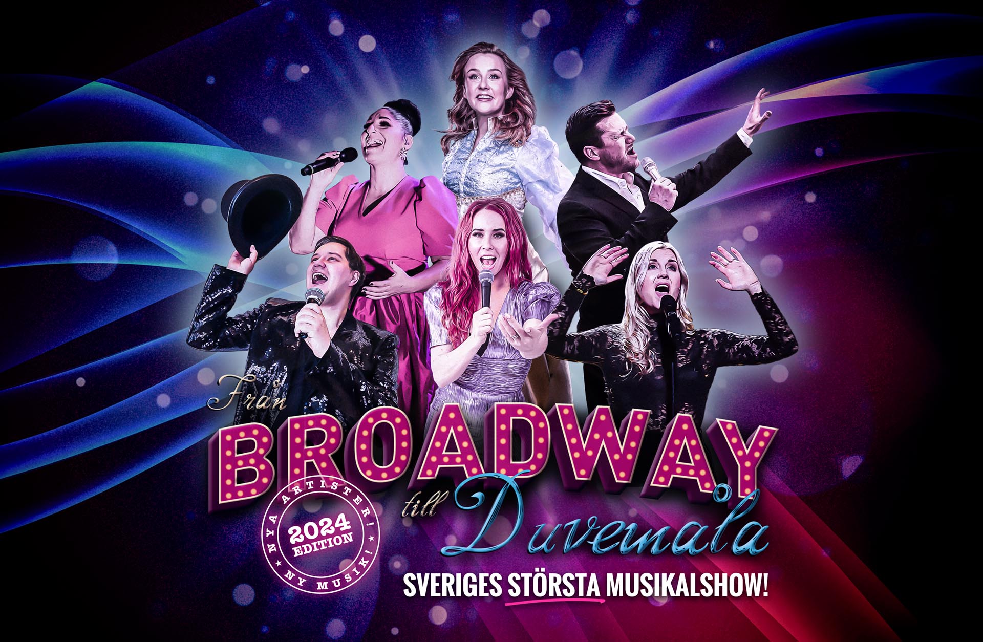 FRÅN BROADWAY TILL DUVEMÅLA är Sveriges mest populära musikalshow och en av årets självklara höjdpunkter för alla musikalälskare! Här drabbar stora röster och stora känslor samman i ett pärlband av de mest älskade hitsen från världens största musikaler – allt framfört av några av våra absolut bästa och mest meriterade musikalartister.