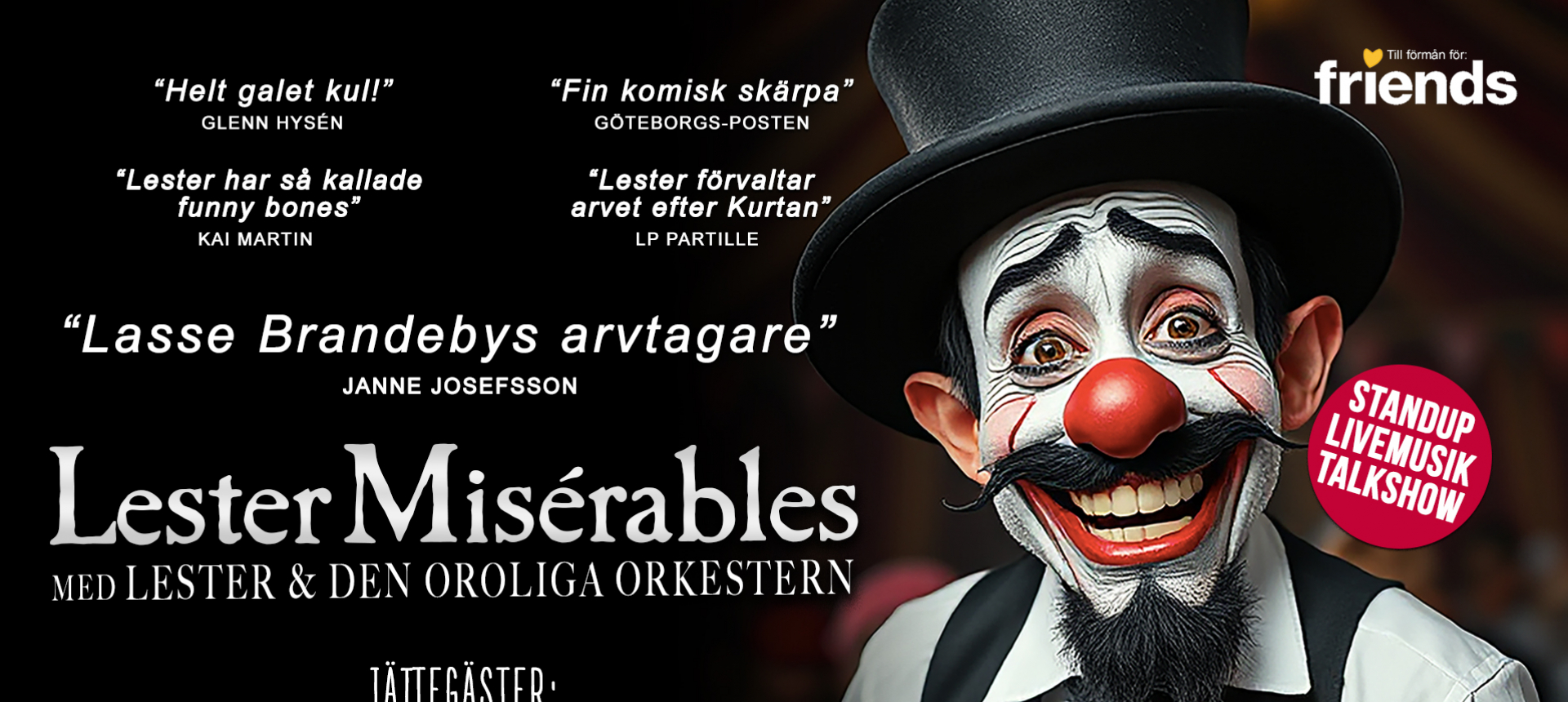 Humorgänget Lester & Den Oroliga Orkestern ger sig ut på turné med “Lester Misérables”, en uppånervänd humorshow och talkshow med helt unika intervjuer med folkkära profiler i sann Kurt Olsson-anda. Allt till förmån för organisationen Friends i kampen mot mobbning.