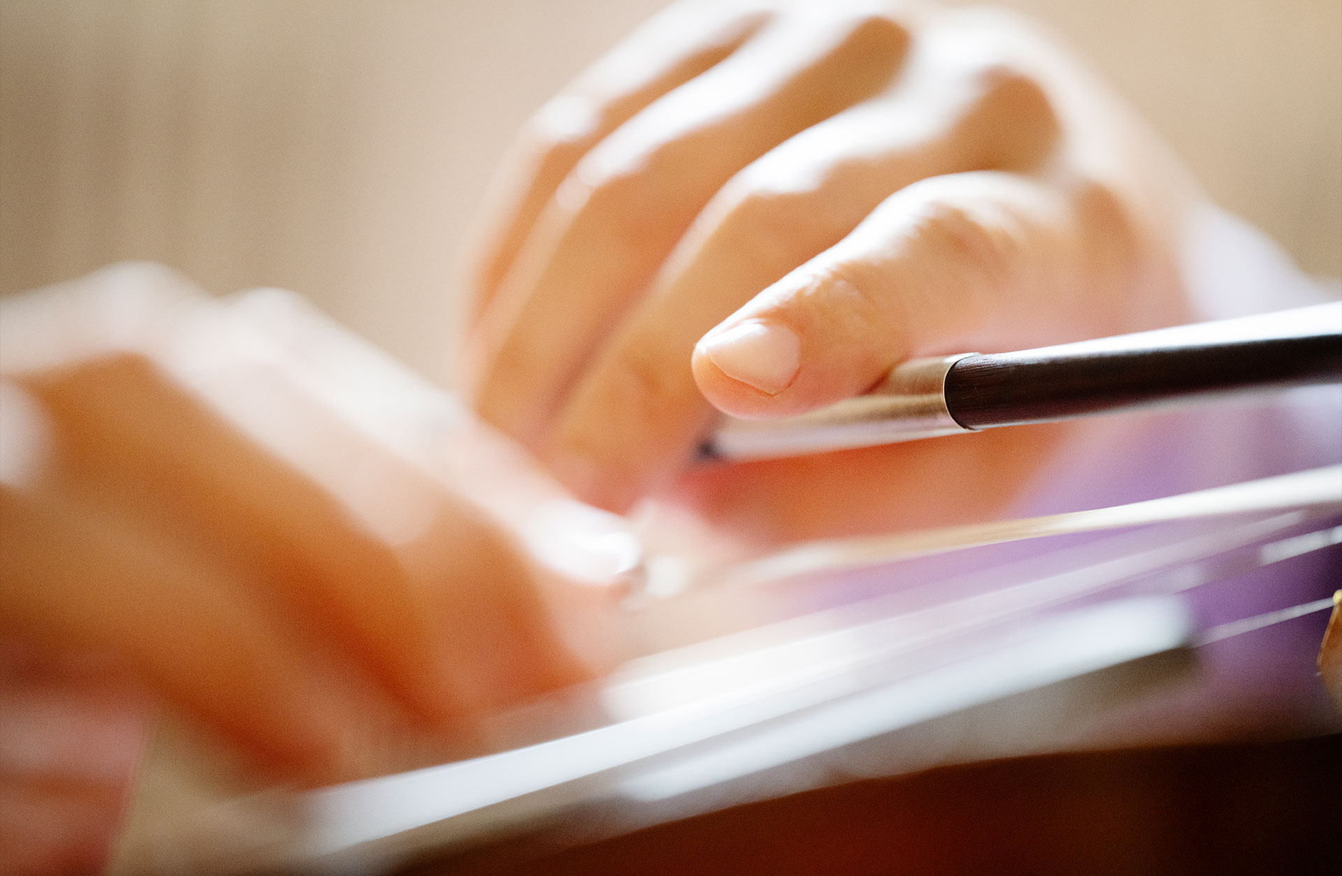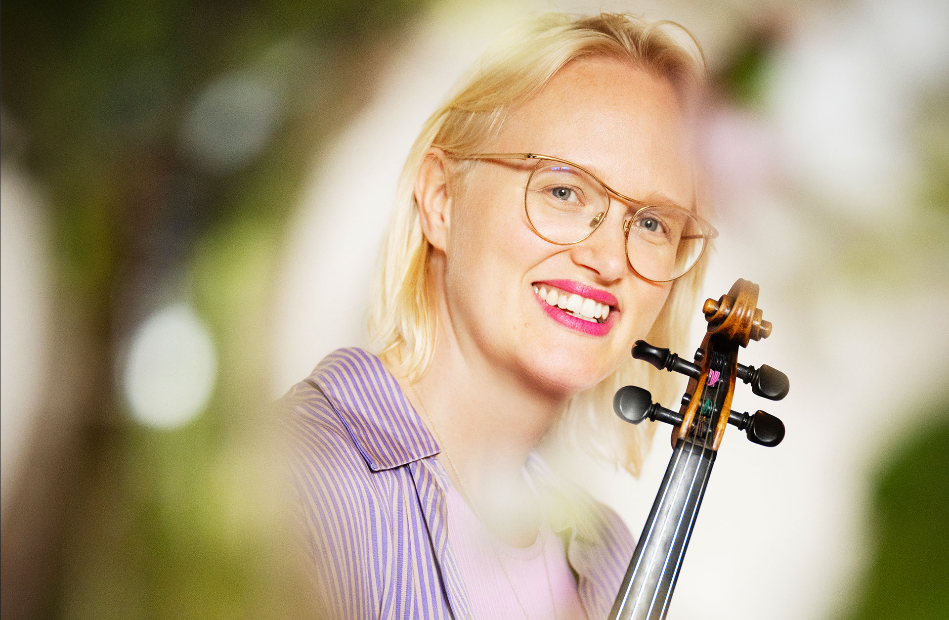Nina Söderberg har bara bott i sin lägenhet i två dagar, det tyder flyttkartongerna på. Men den rektangulära spegeln förstorar den smala hallen, Tiffanylampan är på plats och krukväxterna står på fönsterbrädan. I en hylla i köket syns pinnsmala färgglada modeteckningar i miniformat, signerade Clara Garde, kollega i Göteborgs Symfoniker (se Podiet nr 4 2023-2024). Ett paket välling på köksbänken skvallrar om att här bor det också ett barn.