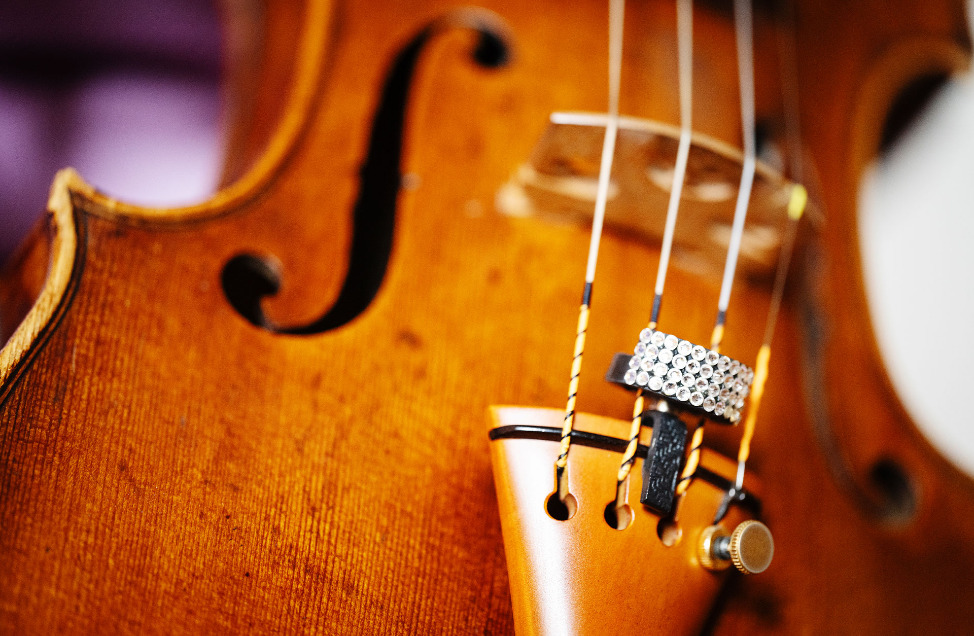 Hon pillar på sordinen, den liknar en ring med glittrande stenar där den sitter nära stallet på fiolen.