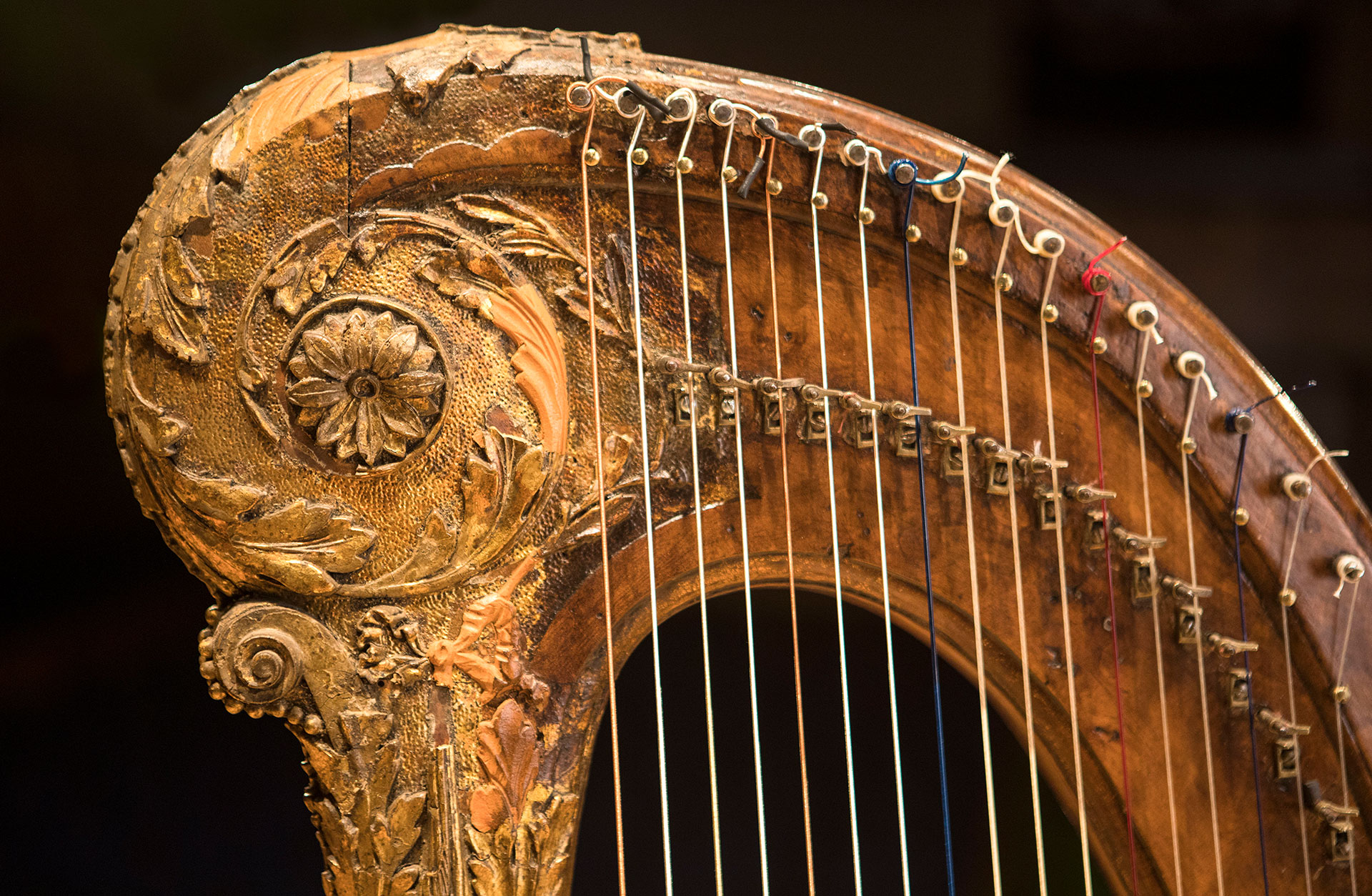 – Harpan är ett av de allra äldsta instrumenten, det finns avbildat på sumeriska och egyptiska målningar som är 4000-5000 år gamla. Då var det format efter pilbågen med några få strängar. I dag är det ett stort och klangrikt instrument med väl tilltagen klanglåda och stort register.