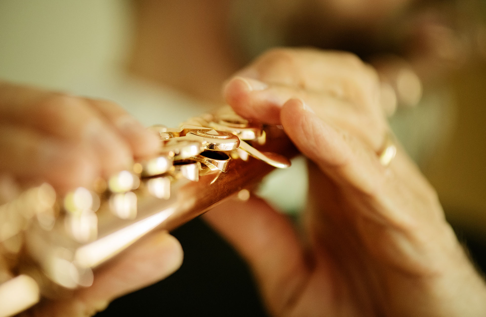 – Det är en Muramatsu i silver, täckt av ett lager av platina på utsidan, en så kallad PTP. Om det finns små partiklar på flöjten så skadas pläteringen. Därför är det viktigt att putsa den ofta, putsduken blir som en snuttefilt. Jag har spelat på den här i 23 år, flöjter har mycket längre livslängd än större bleckblåsinstrument, förklarar han.