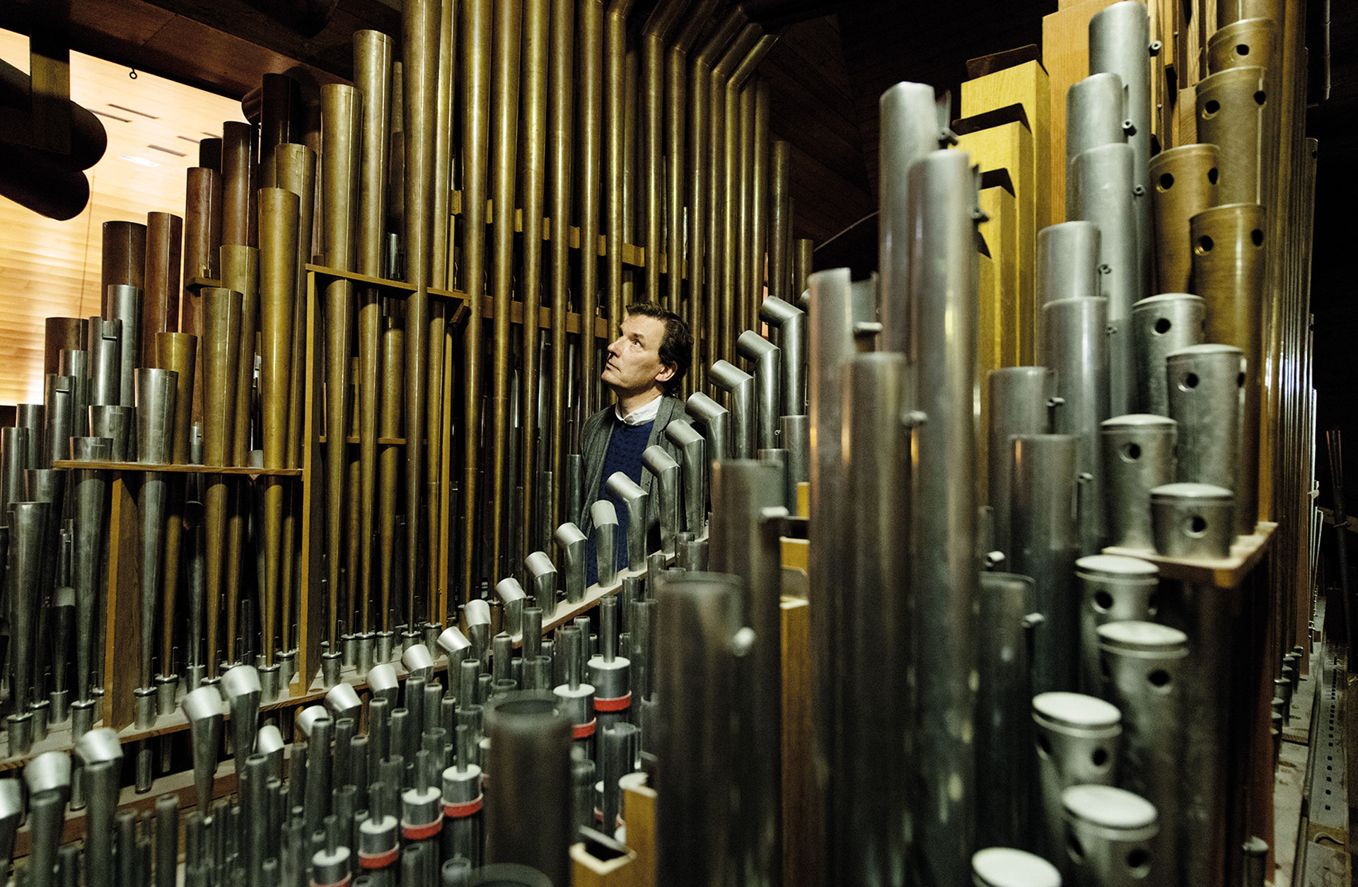 Konserthusets kyrkorgel gömmer sig bakom en scenvägg. Den är som en liten lägenhet med flera meter i takhöjd och en rekorderlig metalltrappa som leder upp till andra våningen. Man kan gå omkring inne bland tusentals orgelpipor som liknar aluminiumfärgade hushållssilar av äldre modell, eller fabriksskorstenar i miniformat. De som frambringar de lägsta tonerna är av koppar och grova som kraftiga dräneringsrör. Erik Risberg har under sina 37 år i orkestern spelat en hel del på den gamle trotjänaren från 1937.