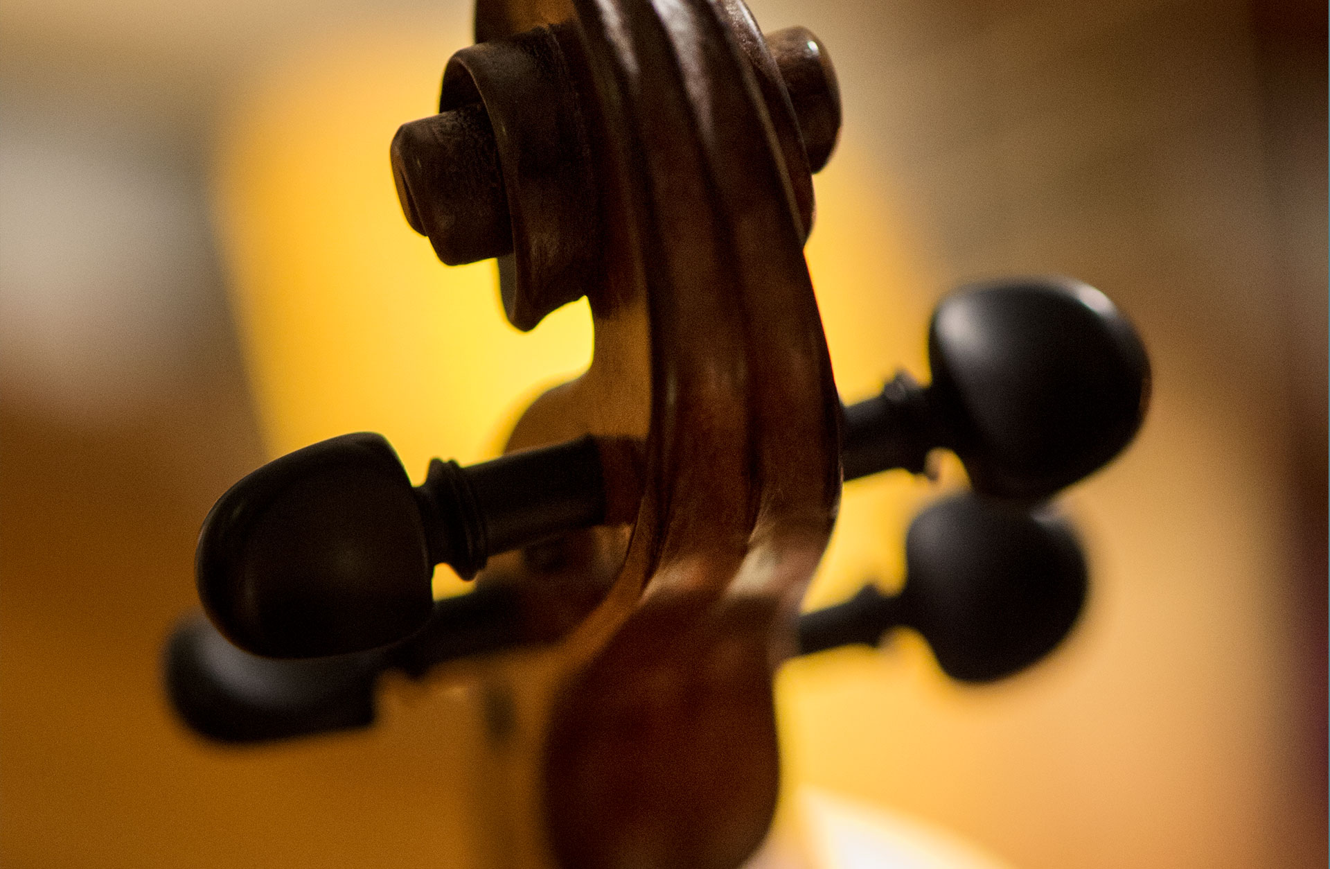 Fiddlan har inläggningar av mörkt trä och ljusa detaljer i skimrande trä. Instrumentmakaren använder virke från lokala brittiska lövträd, träslag som låter som musik i öronen; lönn, päron och plommon, järnek och buxbom.