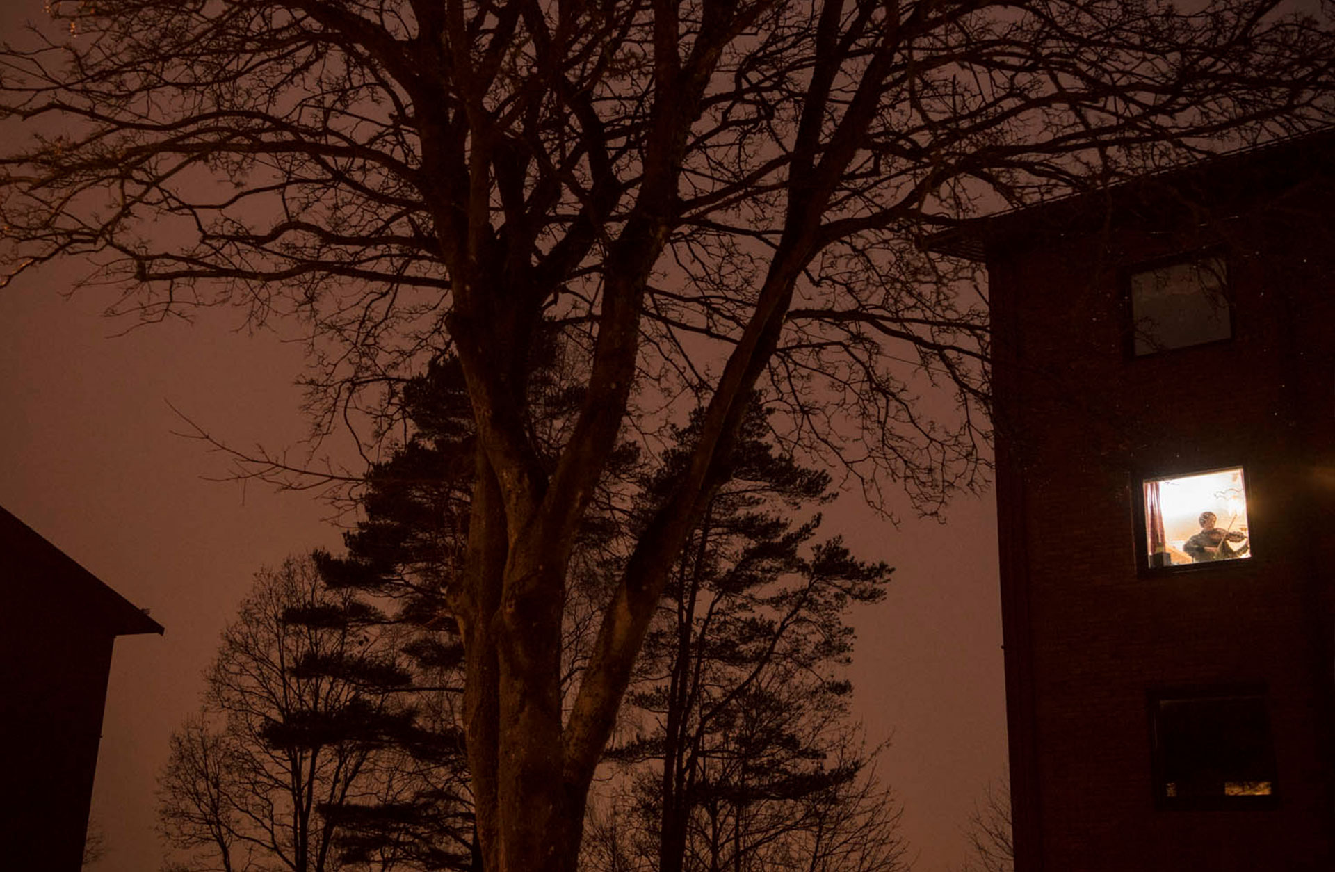 Barockviolan ligger i ett fodral intill. När hon ska stämma den knäpper det till när en av strängarna av fårtarmar släpper. Det är lite pyssel innan hon får fast den igen. På fingertopparna syns hennes valkar. Instrumentet låter mustigt och har ett frasigt sound när hon spelar.