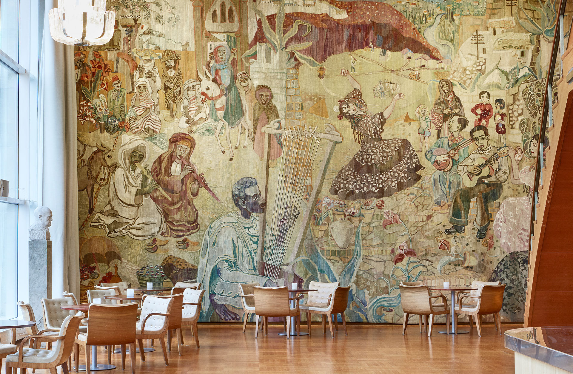 Jag insåg snabbt hur Konserthusets arkitektur kompletteras av konsten som huset rymmer. Som till exempel de eleganta lamporna från Orrefors skapade av glaskonstnären Simon Gate, och den pompösa och berömda gobelängen Melodier vid torget av Sven X:et Erixson. Att jag får omges av ett sådant underbart hus under flera kvällar i veckan ledde mig till att ta initiativet till nya guidade turer i huset. Med start under våren fokuserar de på konsten, arkitekturen och designen. Genom mitt arbete med den guidade turen, som vi kallar Husets harmonier, har jag fått fördjupa mig i alla konstverkens historier. Särskilt gobelängen har fångat mitt intresse, med dess enorma motiv som för dig in i en annan värld. Intresset för verket har nu inspirerat till min B-uppsats.