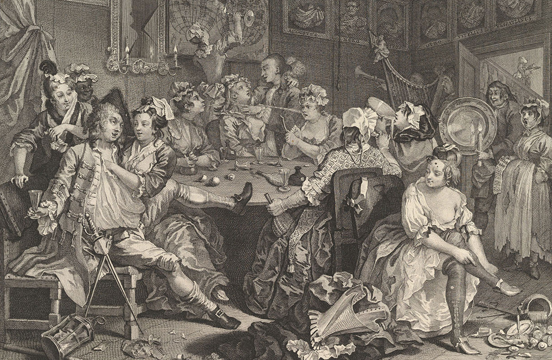 Den engelske konstnären William Hogarths etsning A scene in a gaming house ur sviten En rucklares väg som inspirerade Igor Stravinsky till operan.