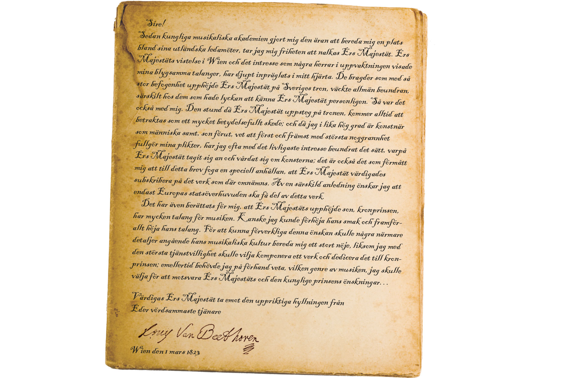 Sedan kungliga musikaliska akademien gjort mig den äran att bereda mig en plats bland sina utländska ledamöter, tar jag mig friheten att nalkas Ers Majestät. Ers Majestäts vistelse i Wien och det intresse som några herrar i uppvaktningen visade mina blygsamma talanger, har djupt inpräglats i mitt hjärta. De bragder som med så stor befogenhet upphöjde Ers Majestät på Sveriges tron, väckte allmän beundran, särskilt hos dem som hade lyckan att känna Ers Majestät personligen. Så var det också med mig. Den stund då Ers Majestät uppsteg på tronen, kommer alltid att betraktas som ett mycket betydelsefullt skede; och då jag i lika hög grad är konstnär som människa samt, son förut, vet att först och främst med största noggrannhet fullgör mina plikter, har jag ofta med det livligaste intresse beundrat det sätt, varpå Ers Majestät tagit sig an och vårdat sig om konsterna; det är också det som förmått mig att till detta brev foga en speciell anhållan, att Ers Majestät värdigades subskribera på det verk som där omnämns. Av en särskild anledning önskar jag att endast Europas statsöverhuvuden ska få del av detta verk.