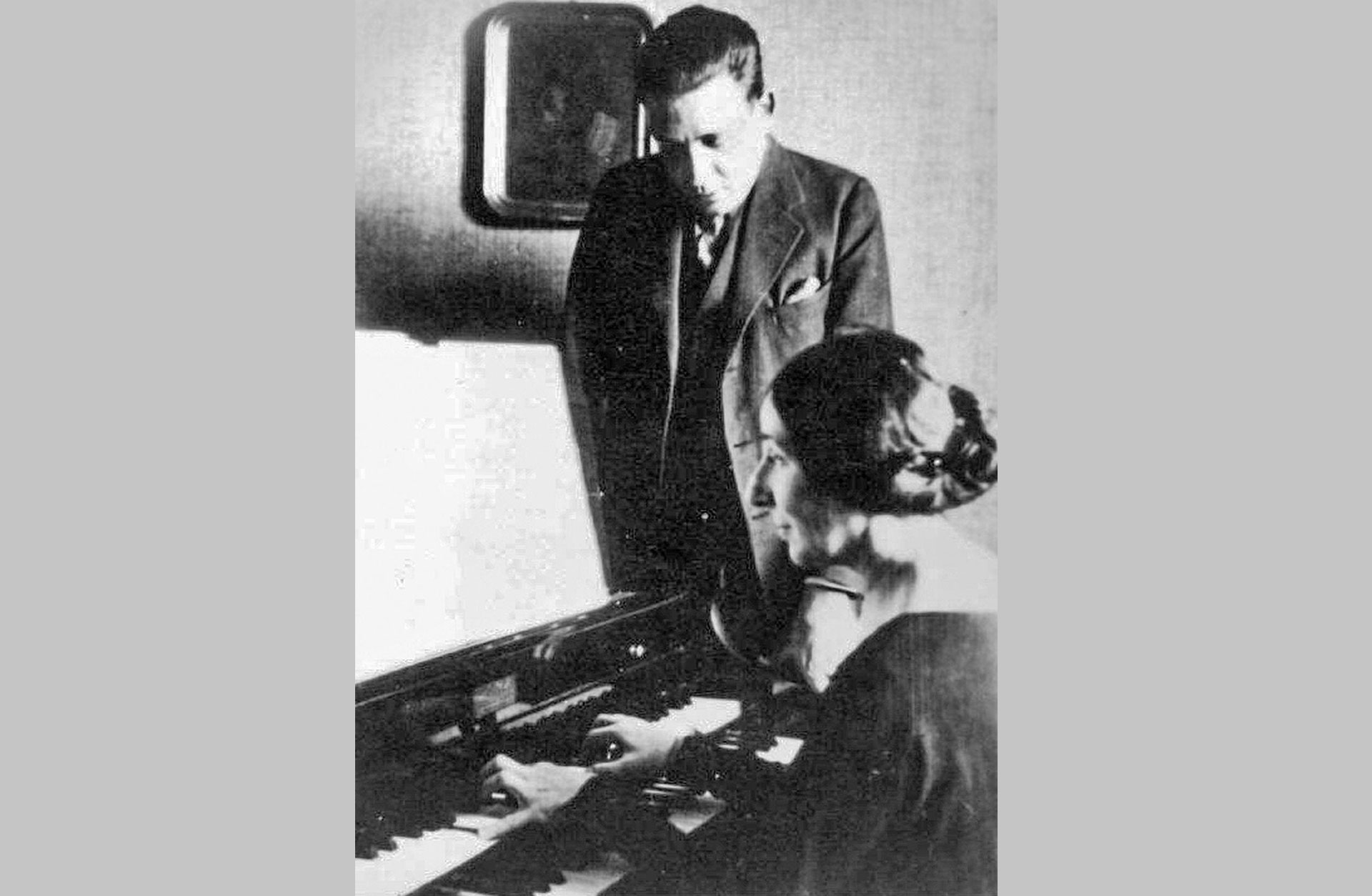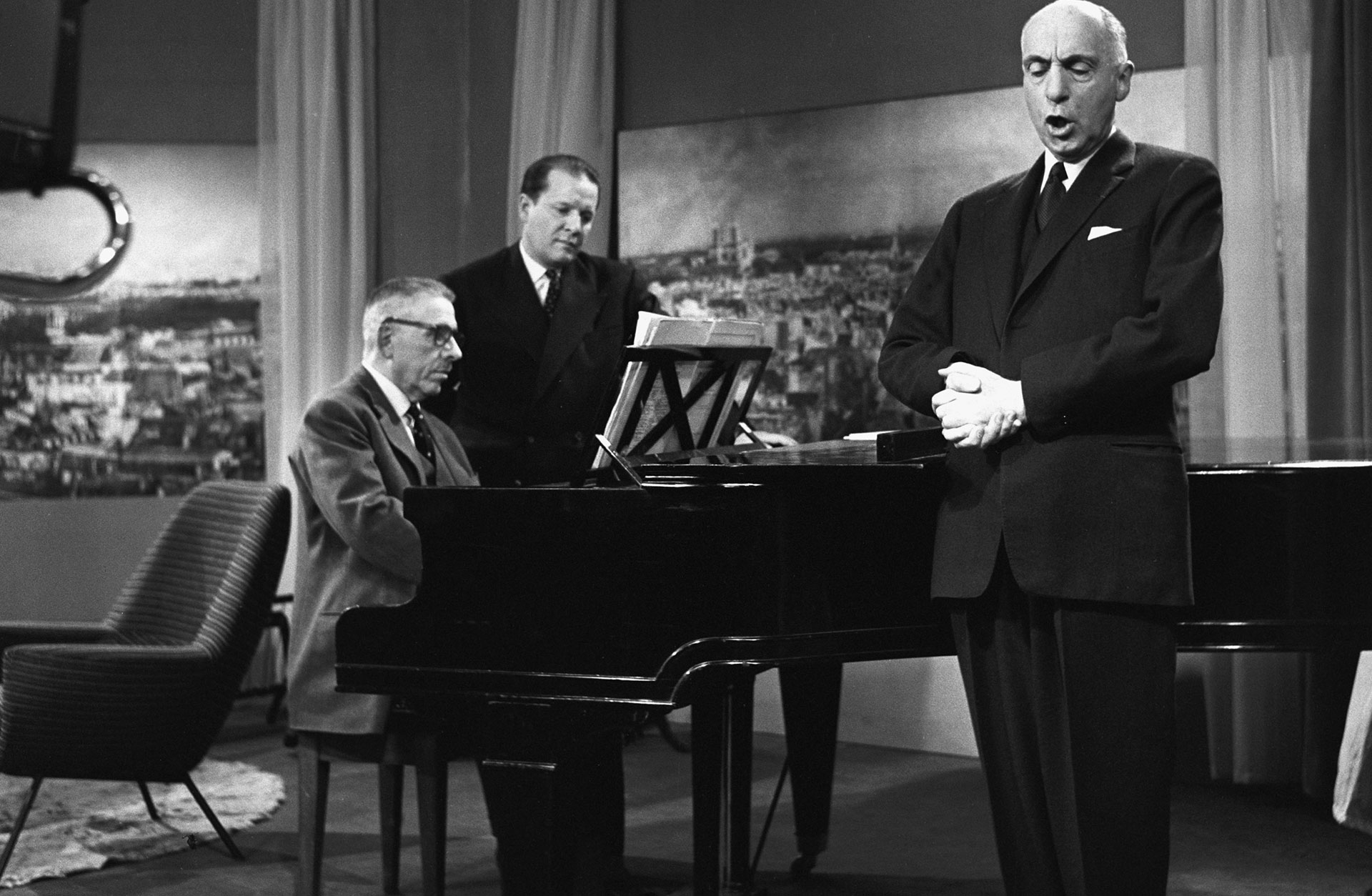 Pierre Bernac ackompanjeras av Francis Poulenc under överinseende av programledare Bernard Gavoty vid en tv-inspelning av ”The Big interpreter”.