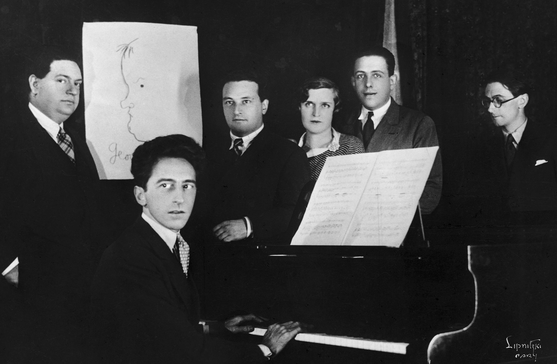 Kompositörsgruppen Les Six med sin talesperson Jean Cocteau vid pianot. Från vänster: Darius Milhaud, en teckning som representerar Georges Auric, Arthur Honegger, Germaine Tailleferre, Francis Poulenc och Louis Durey.