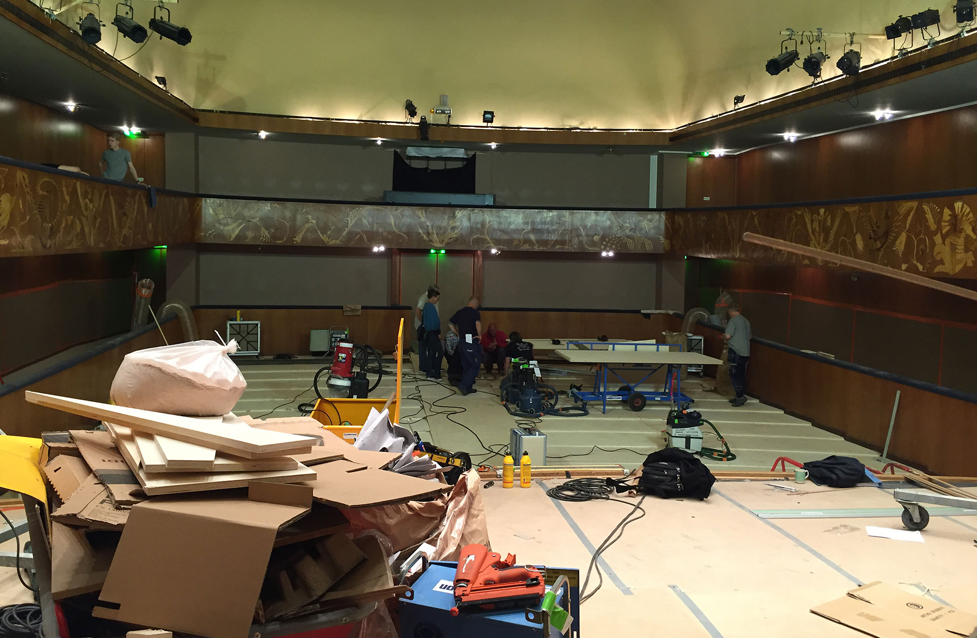 Man var först ut i Stenhammarsalen med att skruva loss och demontera salens närmare 400 stolar. I mitten av juni, när alla konserter och uthyrningar var avklarade, påbörjade man samma arbete i Stora salen. Det skruvades, hamrades och sågades så det ekade i huset. Arbetet är mer omfattande än man i förstone kan tro. När de gamla stolarna tagits bort revs de gamla golvmattorna bort och underlaget förbereddes och jämnades inför nästa steg. Vissa reparationsarbeten och byten av träreglar krävdes också.