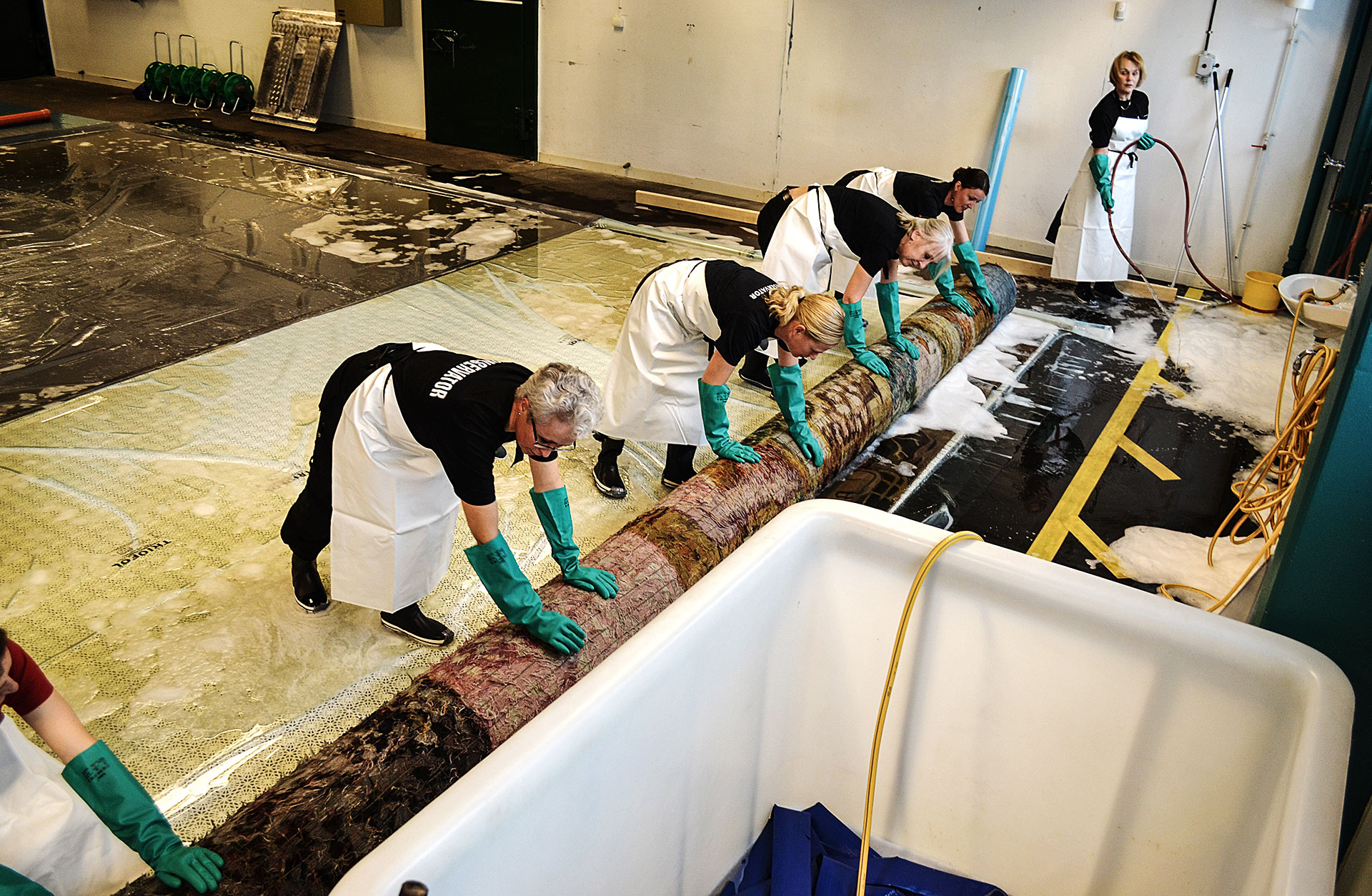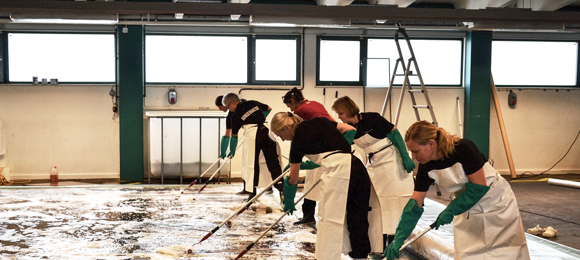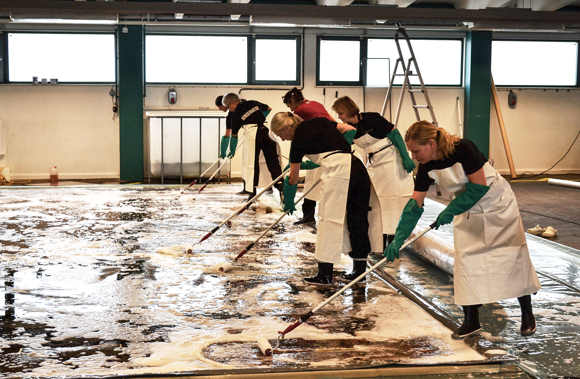 Arbetet utfördes av textilkonservatorer vid Studio Västsvensk Konservering i Göteborg på uppdrag av fastighetsägaren Higab. Genom rengöringen återfuktades ullen så att färgerna och materialet fick tillbaka sin lyster.