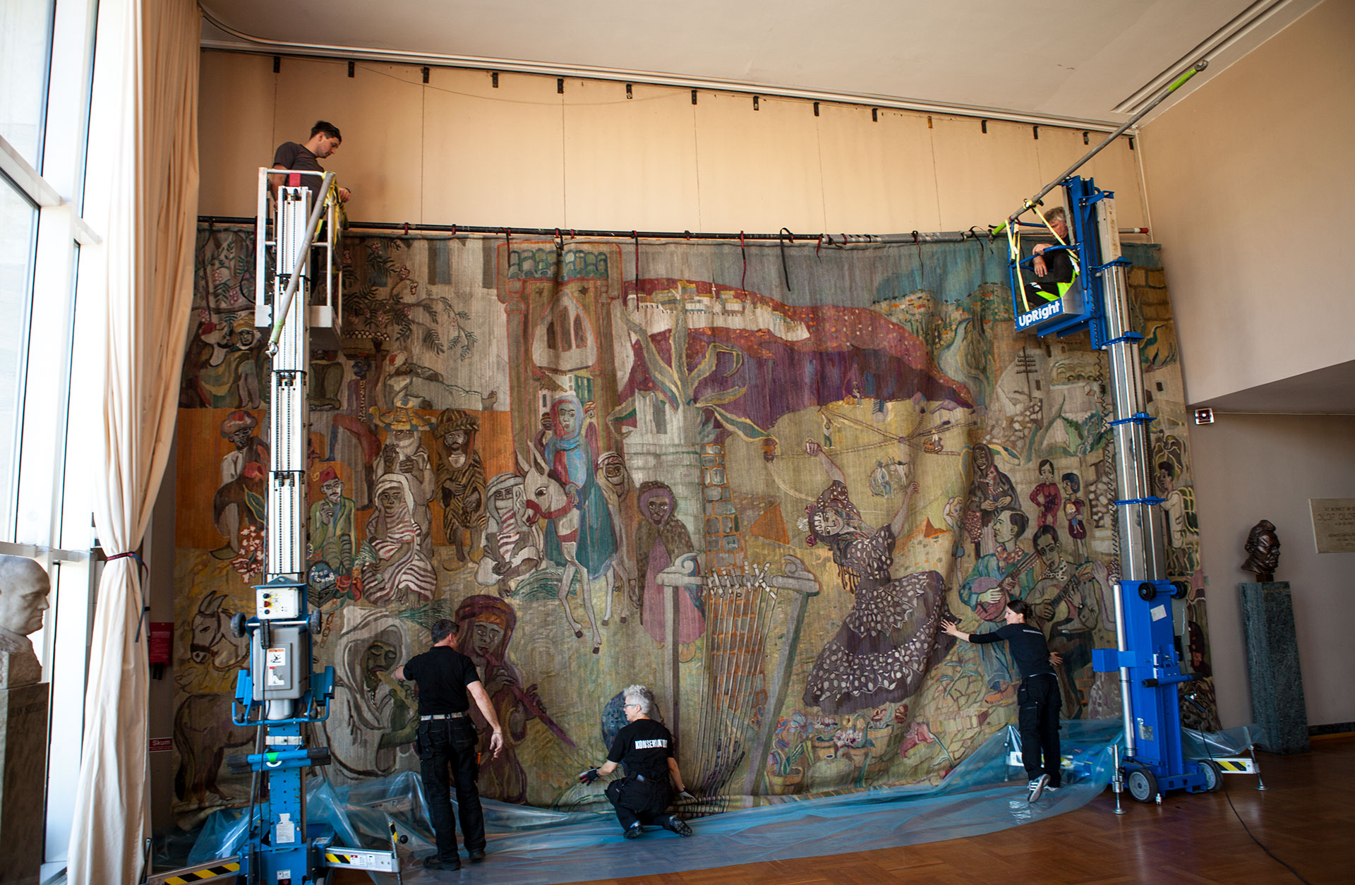 Den nya upphängningen skyddar väven och underlättar framtida rengöring. Att hantera en så stor och ömtålig väv innebär flera utmaningar. För ned- och återmontering på väggen användes liftar och ställningar. Det är också en utmaning att hitta en lokal som är tillräckligt stor för rengöringsprocessen. Senast väven rengjordes i början av 1980-talet fick man hålla till i en bilhall.